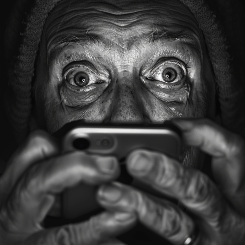 Close-up lifestyle portrait, person's horrified face above prominently featured iPhone, device held at chest height, both hands clutching iPhone while reading screen, face lit by screen glow, expression of pure panic, premium photography --v 6.0
