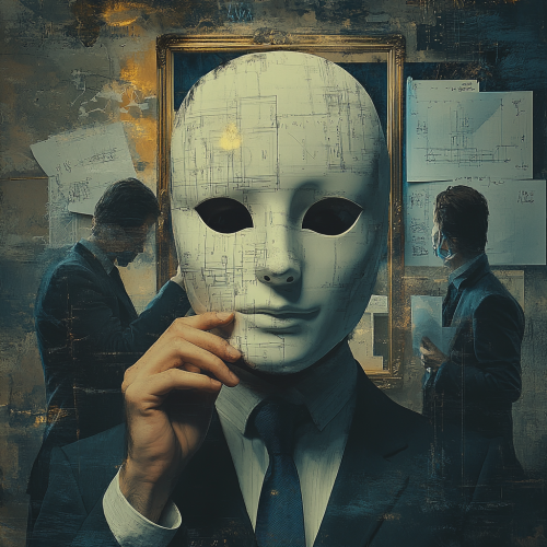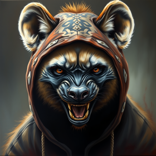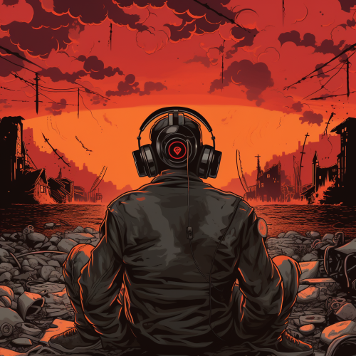 The image is an illustration of a person wearing a hooded jacket and a beanie, with a mask covering the lower half of their face. They are holding headphones over their ears with both hands. The person's hands and arms are covered in tattoos, and they are wearing a large wristwatch. The background is a mix of swirling colors, predominantly in shades of brown and blue. In the top left corner, there is stylized text that reads "Evolution Brand." The overall style of the illustration is gritty and detailed, with a focus on the character's attire and tattoos.