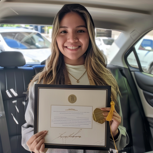 Una persona hispana, vestida profesionalmente, sonriente, sosteniendo un diploma en una mano y las llaves de un coche en la otra, con un fondo de ciudad moderna ar 9:16 --v 6.0