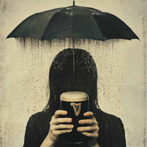 create an image in the style of a graphic design advertisment of Bauhaus. A person holding a pint of Guinness in front of their face. The Guinness covers the person's face except their eyes, which are looking forward. Above the person is an umbrella which is as wide as the Guinness. There is rain pouring down around the person.