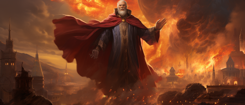 homelander villan hovering in the air, the whitehouse in flames in the background, tattered cape, --ar 21:9 --s 250
