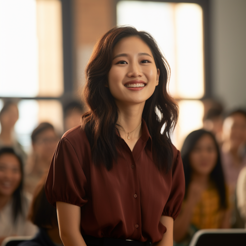 Constance Wu as a teacher welcomes students, close up, smile and positive, photorealistic