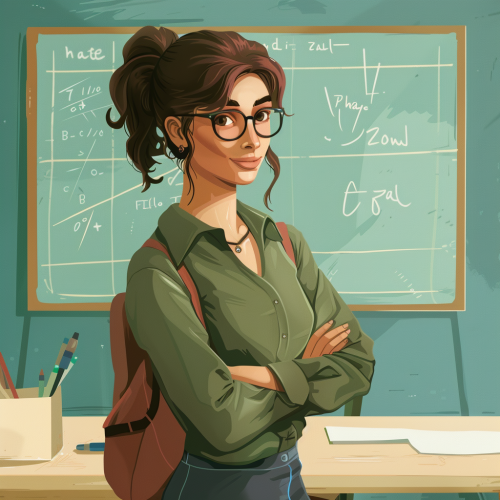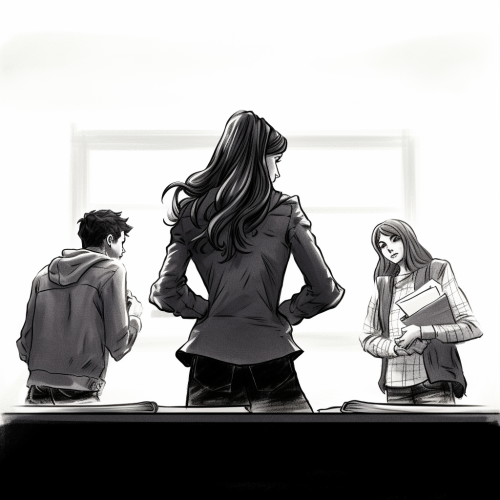 Picture of a female teacher with long hair standing in front of three students who are sitting in desks. The teacher is at center with clakboard in back. Students are facing the teacher, showing only the backs of their heads. Use black line pencil sketches. Sketchy style. One of the sitting students has a raised hand. Comic book style of Will Eisner. PNG. storyboard style.