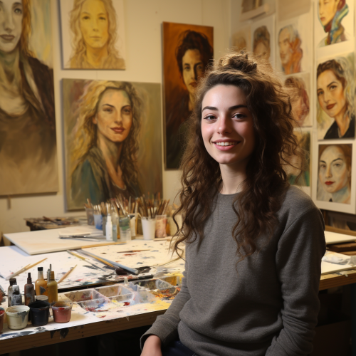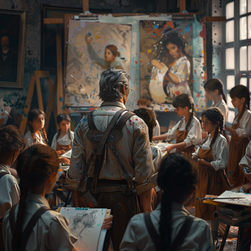 a thirty-year-old male teacher , seen only from the back, in the middle of a class of girls in art class, many works with tablets some analog with oil or other techniques unreal engine