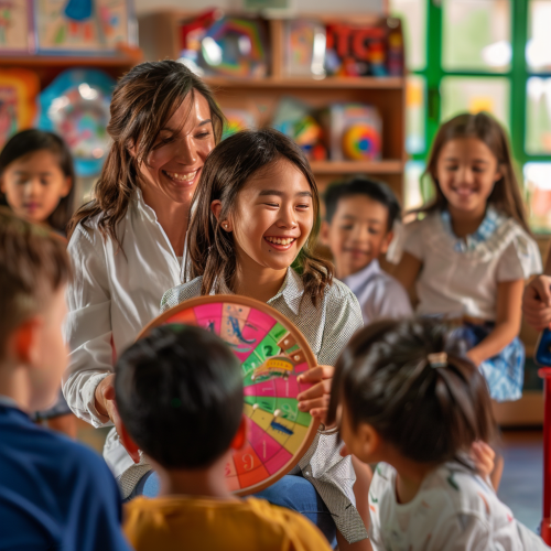 A comic-style illustration of a teacher spinning a colorful "5-minute roulette" in a classroom filled with engaged students. Each section of the roulette displays a different quick activity, bringing energy and excitement back into the room. Bright colors, energetic scene, modern comic style --v 6.0