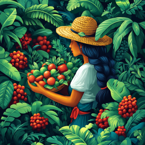 create a cover for a alcaline food list with a indigenous women collecting healthy food like vegetables, fruits, seeds and nuts in the amazon jungle. warm tones and illustradet. --s 750 --style raw