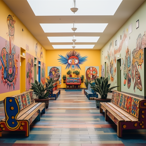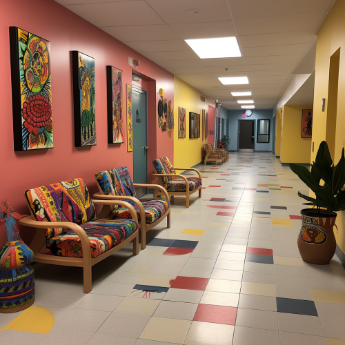 middle school hallway with chairs where students sit and lounge together. decorated with colorful mexican textiles, comfortable public seatings, 1 indigenous culture, space decorated with plants and mexican traditional arts. Cozy atmosphere
