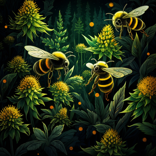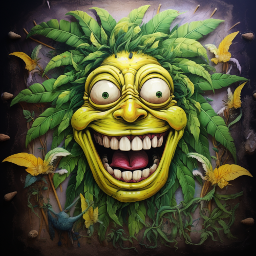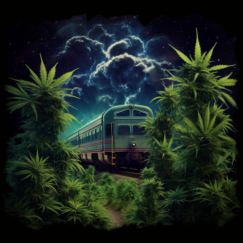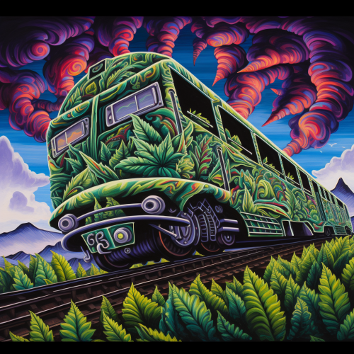 hemp leaves / triple diesel train / riding on top of the train is a group of colorful trippy characters / hemp leaves