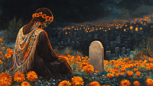 An oil painting of a Mexican indigenous woman in the foreground, her head wrapped in a rebozo and sitting on a grave with a large tombstone serving as a backrest, on the traditional night of the dead. It is nighttime but the candlelight is enough to illuminate the cempasuchitl flowers that adorn the grave. In the background you can see the cemetery filled with candles + Mexican art style + oil painting + --ar 16:9
