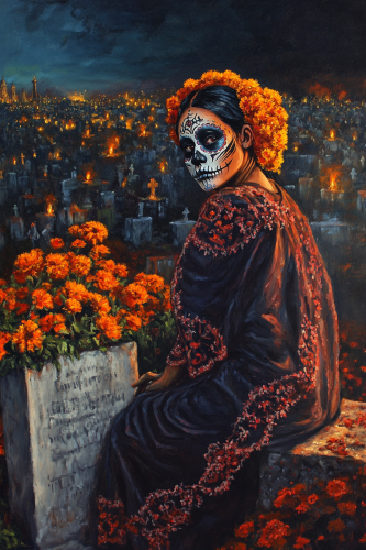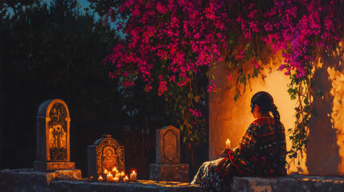 An oil painting of an indigenous Mexican woman in the foreground, she is walking besides a grave on the traditional night of the dead and is wearing catrina makeup. It is nighttime but the light from the candles is enough to illuminate the bougainvillea hanging in the corner. In the background you can see the cemetery filled with candle lights + mexican art style + oil painting + --ar 9:16