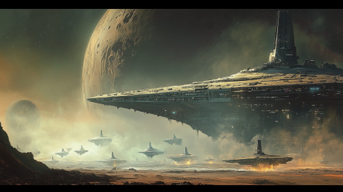 an erie scene of a distant planet, a large spaceship in the foreground is slowly pursuing a flotilla of ships heading towards the distant planet in the background --ar 16:9