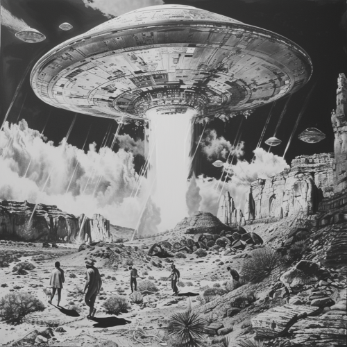 A large spaceship lands on the ground where crystals protrude from the earth and people without equipment stand nearby:: black and white drawing