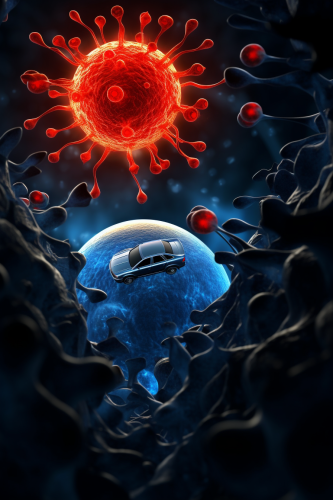 Photorealistic image of working CAR-T cell therapy. A blue T cell bind over a synapse with receptors to a grey cancer Tumor cell. The synapse glows in red --ar 2:3