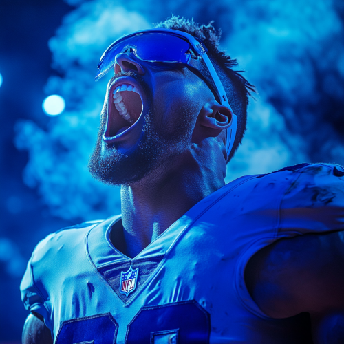 football player yelling, tinted visor, no numbers on jersey, muscles, dramatic shot, neon blue lights, fog, epic, stadium lights, semi close up shot, hdr