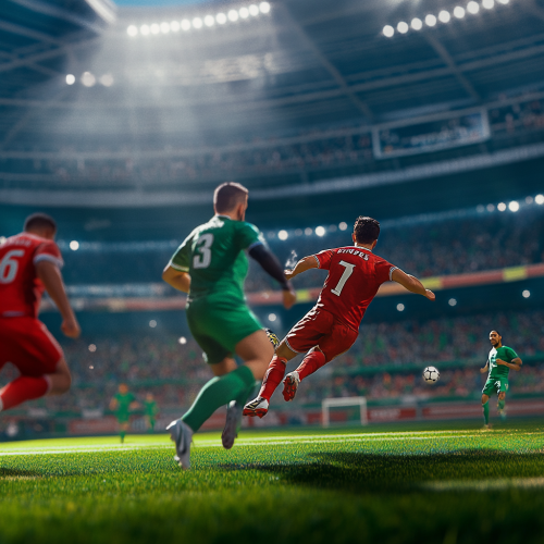 "Create a high-impact advertising poster for a football video game inspired by 'Kings League' and 'FIFA 25.' The scene captures the intensity of a professional football match on a standard football field, with players in action mid-game. The stadium lights shine brightly, illuminating the field and adding to the atmosphere of excitement and competition. The background includes cheering fans in the stands, creating a sense of immersion. Focus on dynamic movement, with players skillfully dribbling, shooting, and competing. The game’s logo should be prominent, conveying the thrill and energy of the sport.