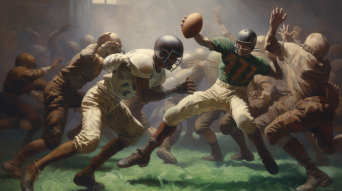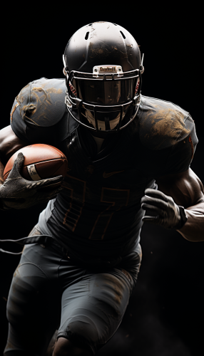 American college football. Silhouette. action shot on the field. Black and white with color splash. Vibrant color splash. Full body shot. Quarterback scoring game winning touchdown in final seconds of the game. Packed stadium. Extreme blue skies. Violent and action-packed. Exciting. Photorealistic. Black and white. High-end. Stylish. Important. Mysterious. Black and white. Shot with a Sony A7R. --ar 4:7 --q 0.5 --s 750