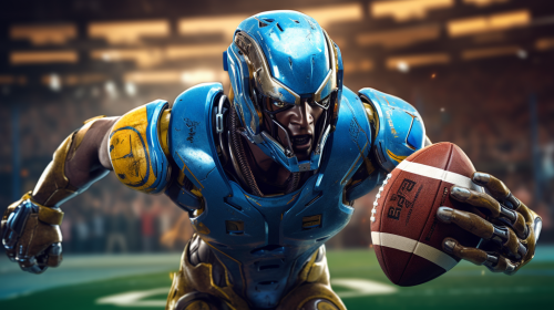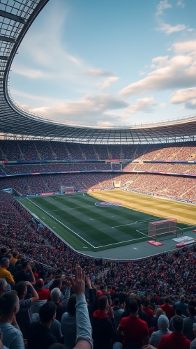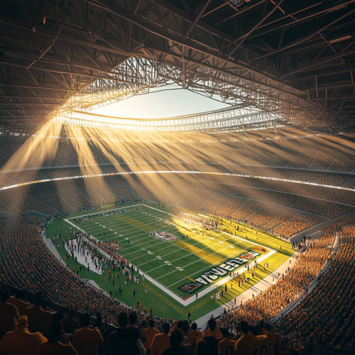 a photo inside if a stadium watching the packers football game at a stadium in Brazil. Make it look a little blocked to a football field. Like a bad fast photo. Make it super photorealistic. Wide angle, super dramatic sunlight.