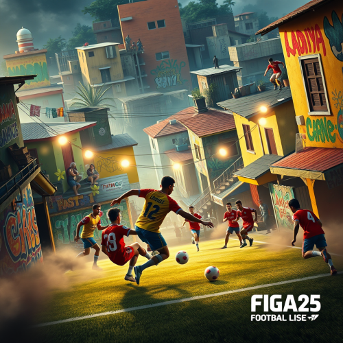 Create a high-energy, dynamic advertising poster for a football video game inspired by 'Kings League' and 'FIFA 25.' The scene should capture an intense football match set in the middle of a lively Brazilian favela. The players are immersed in the game, surrounded by vibrant, colorful favela houses with detailed graffiti. Fans watch from nearby rooftops, creating an immersive atmosphere full of urban energy. The scene should feel gritty, real, and full of movement, with lighting that enhances the intensity of the match, creating a sense of excitement and passion for street football.
