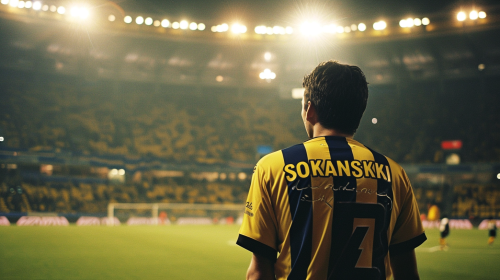 famous fenerbahce football player sebastian syzmanski on the pitch preapering to use a freekick in the match with his fenerbahce jersey on but it’s written "SOKANSKI" on the back of his jersey as his name instead of the original name. Leica Summicron-M 28mm f/2. Kodak Portra 400 film --ar 16:9 --v 6.0 --style raw
