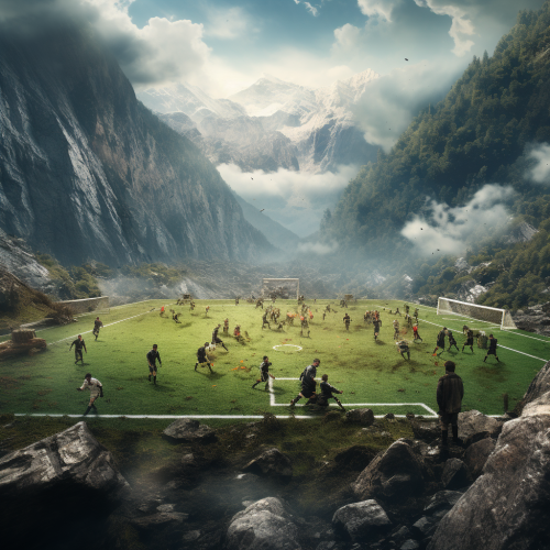 Here's the prompt for creating a realistic image: "A realistic, high-intensity scene from a FIFA World Cup football match between Brazil and Argentina. The close-up captures two players--one from each team--engaged in a fierce on-field struggle for the ball. Both players are wearing their respective team jerseys, but instead of their faces, they have the iconic hooded, faceless look of René Magritte's characters. The stadium is filled with cheering fans, with a mix of vibrant Brazilian and Argentinean flags waving in the background, adding to the tension of the moment." --v 6.0