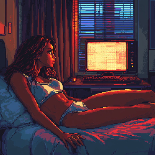 pixel art, game art, 16 bit, bedroom scene, woman with long brown hair laying in bed, desktop computer lit up in the corner, light coming through the window, neon red and blue colors, film noir inspired