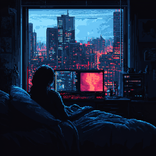 pixel art, game art, 16 bit, bedroom scene, woman with short brown hair laying in bed, desktop computer lit up in the corner, light coming through a large window with a cityscape, neon red and blue colors, minimalist, film noir inspired