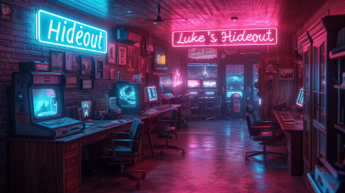 desktop background, abstract colors, space, gaming room, neon sign that says "Luke's Hideout" --ar 16:9 --s 750 --v 6.0