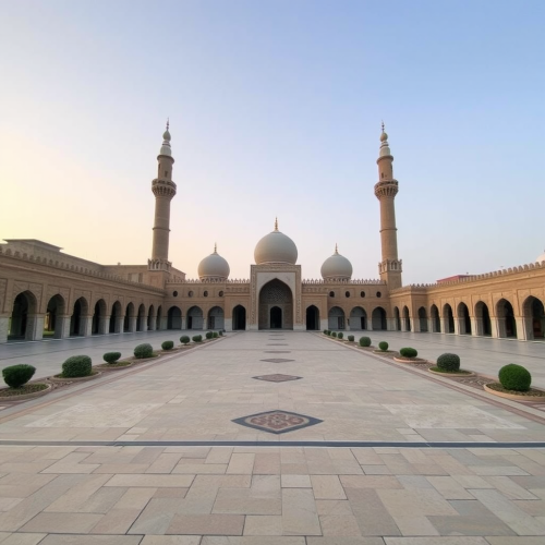 VISUAL STYLE: Paint by Numbers, GENRE: Landscape, SUBJECT(S): Mosque in the desert, TIME PERIOD: Modern, COLOR: Vibrant colors, ASPECT RATIO: 7:4, FORMAT: Digital art, FRAME SIZE: Large, LENS SIZE: Standard, COMPOSITION: Centered mosque, LIGHTING: Bright midday, LIGHTING TYPE: Natural light, TIME OF DAY: Noon, ENVIRONMENT: Exterior, LOCATION TYPE: Desert, SET: Desert landscape with sand dunes, CAMERA: Digital camera, LENS: Standard lens, FILM STOCK / RESOLUTION: High resolution, TAGS: mosque, desert, paint by numbers, coloring frame --v 6.0 --ar 7:4