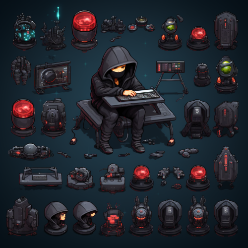 top down hacker character, game asset, 2d, top view, transparent background, multiple positions