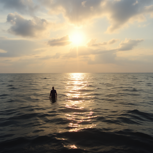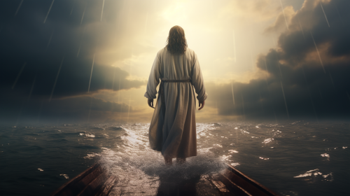 Jesus walking on water in the Sea of Galilee: Illustrate Jesus walking on the water of the Sea of Galilee amidst a storm, with his astonished disciples in a nearby fishing boat. choppy waters and a dark sky, highlighting the miracle of his divine power. cinematic photoshoot, high detail, hyper realism 8k. --ar 16:9
