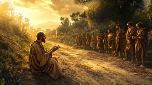 in the context of Luke 18:35-43, show a blind man with closed eyes sitting on a dirt road shouting and reaching his hands out to Jesus, Jesus is walking by with his 12 disciples, photorealistic, Cinematic, 10k, high quality, intricate details --aspect 16:9