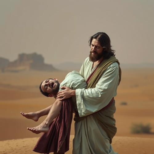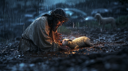 jesus takes care of the lost lamb that gets stuck in the mud, rainy, muddy, dark, thunderstorm, , photo realism 4K high contrast, super detailed, Tone Mapping, Ray Tracing Global Illumination , Optical, Scattering, Glowing, Shadows, Rough, Shimmer, Ray Tracing Reflections, Lumen Reflections, Screen Space Reflections, Diffraction Gradation,beautifully coded by color, insane detail, intricate detail, beautifully colored, Unreal Engine, Cinematic, Color Grading, --ar 16:9 --v 6.0
