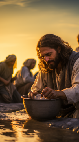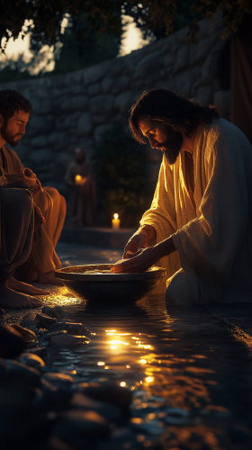 HDR ,cinema 4d, ultra-high definition resolution, glowy image, golden hour, 32k,realistic photo, Jesus washing the disciples' feet, a humble act of service, with water in a basin reflecting soft candlelight. , clear and detailed – golden hour, perfect, shot in the style of Ansel Adams, captured with a Hasselblad H6D-400c. --ar 9:16 --stylize 150 --v 5.2 --style raw