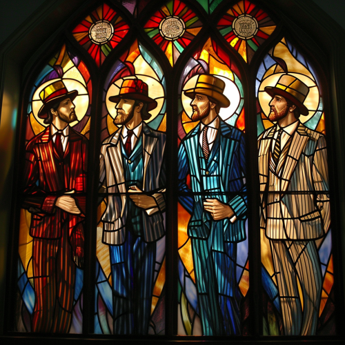 a church stained glass window with Jesus and disciples dressed as 1910 barbershop quartet in skimmer hats pin stripe suits --v 6.0