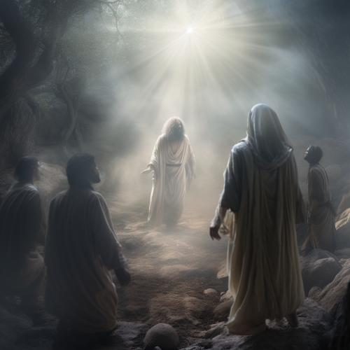 An image of the disciples of Jesus encountering what they believed to be the ghost of Jesus, photorealistic, 8k camera quality