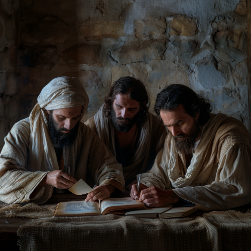 An ultra-realistic photograph captured with a Sony α7 III camera, equipped with an 85mm lens with F 1.2 aperture, depicting Jesus' disciples, sitting at a table, writing letters --v 6.0