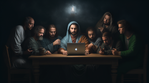 Renaissance style painting of the last supper with jesus and his disciples sitting around an apple laptop in the middle, Dystopian dark lit backdrop, Top - Down shot, hyper real, rembrandt lighting, --ar 16:9