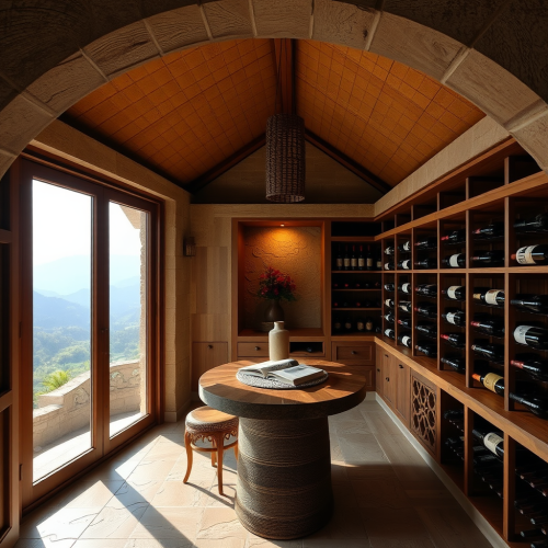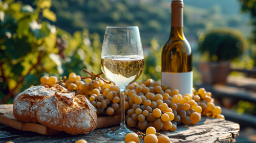 Stock photography. A branch of grapes, a bottle and two glasses of wine and freshly baked bread close-up on a wooden table that stands on an open terrace along with cozy armchairs overlooking the Taragona vineyards. large depth of field, maximum texture detail, light blurred background, white balance 5500 16K Very realistic --ar 16:9 --v 6.0 --s 750