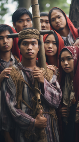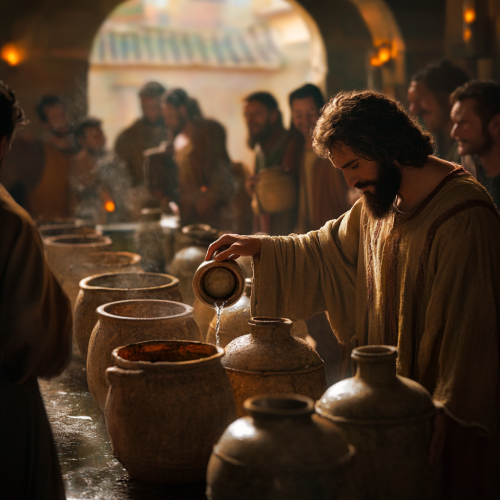 Capture a cinematic 9:16 image of Jesus turning water into wine at the wedding in Cana, his first recorded miracle in the Gospel of John. The scene shows Jesus standing near large stone water jars, his hand raised in a calm yet authoritative gesture as the transformation occurs. In the foreground, servants pour water into the jars, and as they pour, it visibly turns into rich, red wine. Jesus is depicted with a peaceful expression, embodying both divine power and joy in the celebration. The wedding guests in the background are laughing and enjoying the moment, unaware of the miracle that just took place. Use the perspective as if shot with a Nikon D850 camera and a Nikon AF-s NIKKOR 70-220mm f/2.8E FL ED VR lens, focusing on the fine details of the water transforming, the textures of the jars, and the expressions of Jesus and the servants. The warm light from oil lamps illuminates the joyous atmosphere, emphasizing the contrast of Jesus as both a divine figure and a participant in human celebration