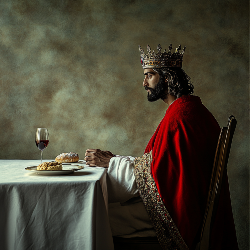Jesus dressed as a king, red cape, crown, sitting at a 2-seater dining table, with the other empty chair in front of him. He is waiting for the other person, but he hasn't come. Side view, side image position. Dark-skinned, Jewish-looking Jesus, in profile looking at the empty chair in front of him. On the table there is bread and wine. make an empty chair on the other side of the table. 8k. do not crop the image. Leave the bigger picture. Jesus, table, chair.