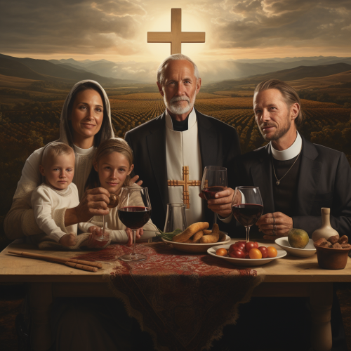 a album cover, modern a group of 3 generation family in holy communion a cup of wine, bread, cross