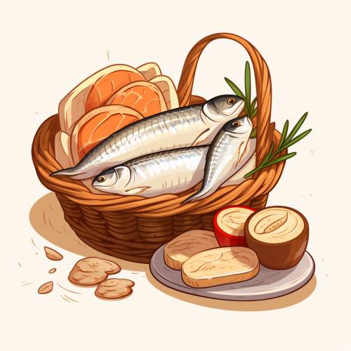 FOOD IN BASKET TIME OF JESUS BREAD AND FISH WHITE BACKGROUND CARTOON STYLE FUUL HD DISNEY STYLE