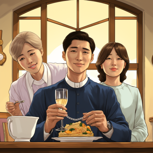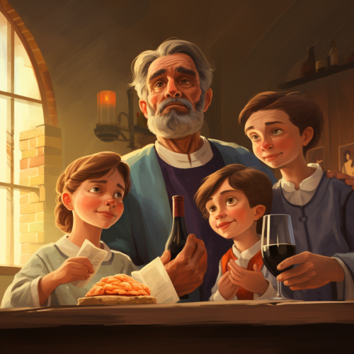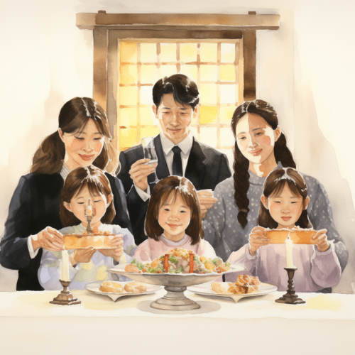 a album cover, korean modern a group of 3 generation family in holy communion a cup of wine, bread, cross watercolor