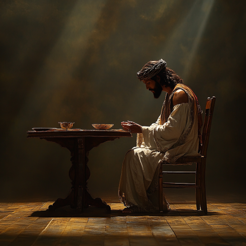 Jesus dressed as a king, sitting at a 2-seater dining table, with the other chair empty. he is sad and disappointed as he was ignored and left to eat dinner alone. Take his view from the side.