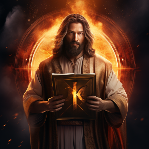 a middle age icon of Jesus Christ with the letter K and the number 18 all around him and on the holy bible.