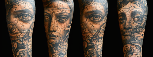 Full arm sleeve tattoo of the Second Coming of the Lord Jesus Christ, Son of Man. Revealed, Days of Noah, Fire behind, Lightning, Earthquakes, Armageddon, Portrait of Christ, Eyes of Flaming Fire, Lion of Judah, Universe, 16K, --chaos 32 --ar 8:3 --s 1000 --v 6.0