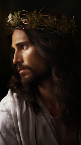 Create a professional-grade, high-resolution photograph depicting a biblical scene with Jesus wearing a crown of thorns. Jesus should be portrayed with a solemn, contemplative expression, pointing towards a message that reads, "Do you really want to waste so many years of evolution?"grammar spell .The image should capture the profound juxtaposition of a biblical figure with a contemporary question. Focus on making Jesus's expression and the crown of thorns as realistic and detailed as possible, reflecting the traditional iconography. The background should complement the solemnity of the scene, perhaps with soft, subdued lighting. The text should be integrated in a way that it appears Jesus is directly engaging with it, bringing together the ancient and the modern in a thought-provoking composition --v 6.0 --style raw