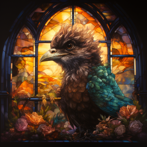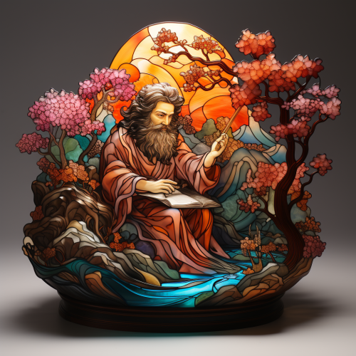 the angelic holy scene of Bob Ross, accepting the spiritual Gift of the Holy Squirrel, Bob Ross and Holy Squirrel, displayed in leaded glass --s 750