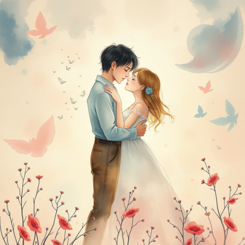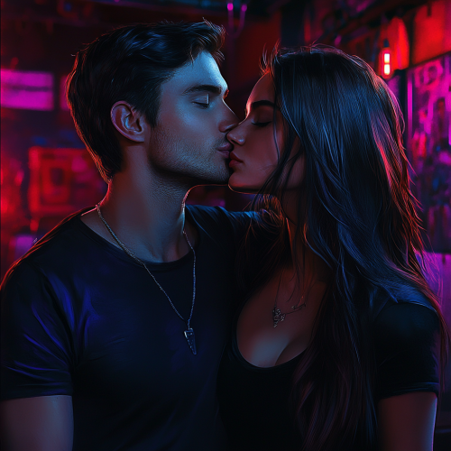 realistic photographer two lovers beautiful , a very handsome man, blue eyes black hair, dressed in black, kisses a girl with long dark brown hair, dark eyes, tshirt black, in a nightclub
