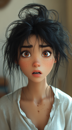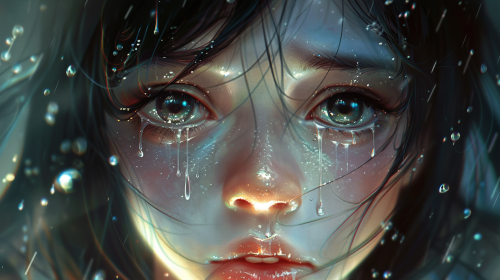 high detailed watercolor clipart of a beautiful girl, dark thick long hair, curls, falling to the side, beautiful soft makeup, girl sad, sensitive mood, hypersensitive, tears in the corner of the eyes, wearing a white beautiful cotton tight t-shirt, black leggings, soft colors , beautiful illustration with realistic details, high resolution, gray background